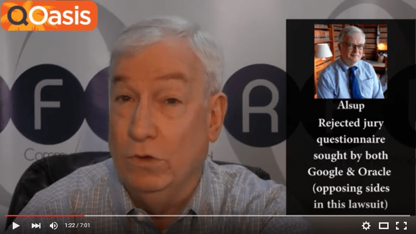 1) Attempts by Google and Oracle to investigate potential jurors on the Internet using information collected from a questionnaire was ruled out by a federal judge overseeing a suit over Java application programming interface copyrights.